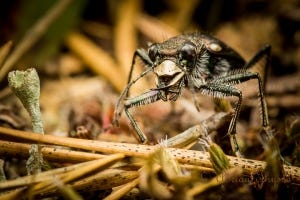 Tiger beetles. They are easiest to find when on the open sands. On the edges of the needle-strewn woods, these pincer-clad beasts blend in with their environment. They prowl on the fringes of the open sandy path and the cluttered forest floor, venturing into both areas in search of prey.