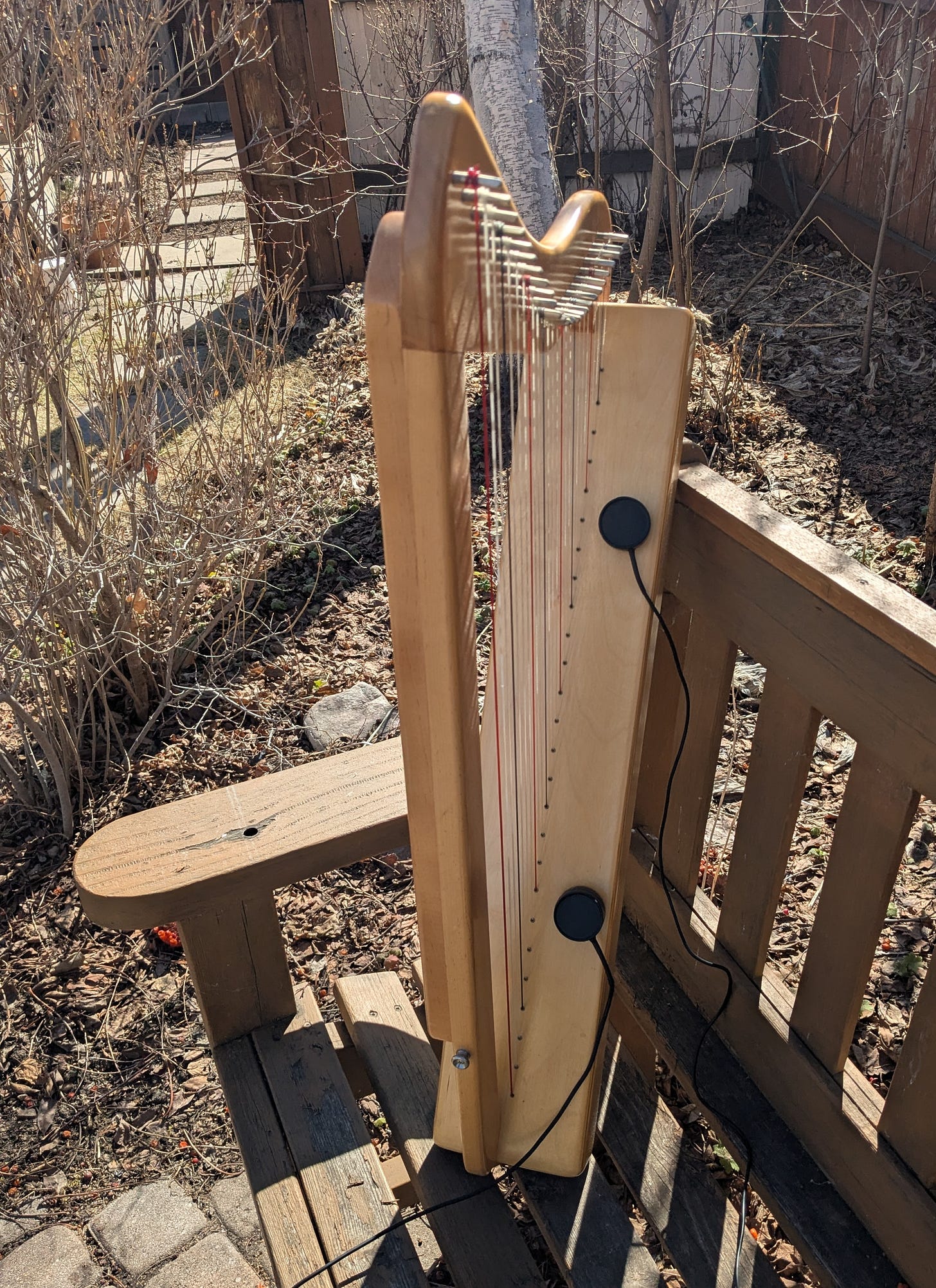 After constructing a stereo pair of contact microphones, I was eager to try them out with different objects. The first test recordings were made with a pint glass and pouring water, and then I turned to using a singing bowl, and in both cases, the results were impressive. What could I turn to next? Our house is littered with musical instruments left behind by our daughter, so I was eager to try using some of them to explore the idea of an Aeolian wind harp. The spring winds were strong a few weeks ago, so I packed my recording kit and brought a Harpsicle® harp outside for a trial.