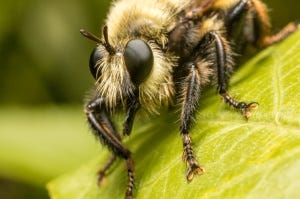 This is a Laphria sp. of robber or assassin fly, showing a fine mystax, the bristly hairs on the face which are believed to help protect it from injury when it tackles its prey. They are sit-and-wait predators that attack and capture other flying insects–including bees and wasps–while in flight. They then use their dagger-like hypopharynx to penetrate into a soft area, inject enzymes, and then suck out the resulting soup of dissolved tissue.