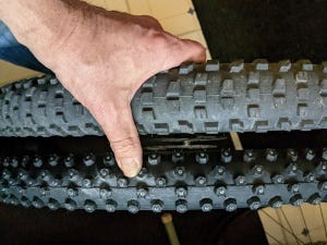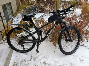 Next, I had to adapt my bike, the Trek Fuel EX5 MTB. I still have the 2.6″ tires that it came equipped with, which are not wide enough for fat bike-like snow flotation, and not grippy enough for hardpacked snow and ice. After checking out some tire reviews online, I settled on two of the mid-range 29 x 2.25″ Icespiker Pros by Schwalbe. With 402 carbide steel studs on each tire and extra puncture protection, these seem to be the best way to go. On the first outing with the bike, I was cautious, but soon found they had excellent grip on ice and packed snow, so I quickly felt confident cycling with them. The only issue I have found so far is that they tend to wallow and shift on the loose, oatmeal-like snow that we often get on residential side streets, and keeping a straight line can be challenging: steady power on the pedals and a firm hand on the handlebars are needed to push through. I am considering swapping out the front Icespiker if I can find a better alternative to deal with this problem.